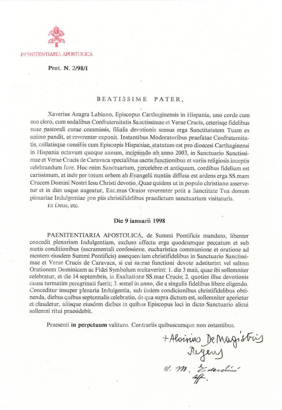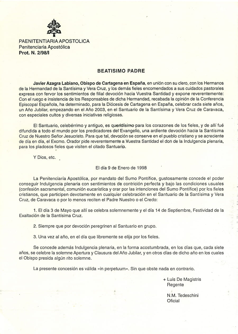 Tras un paréntesis en el tiempo en la celebración de Años Jubilares en torno a la Sagrada Reliquia, aunque no en su devoción, Su Santidad Juan Pablo II tuvo a bien conceder nuevo Año Jubilar a Caravaca de la Cruz en 1981, al conmemorarse el 750 aniversario de la aparición de la Stma. y Vera Cruz en Caravaca. Gracia que fue nuevamente concedida a Caravaca y su Vera Cruz en 1996 por petición de la Real e Ilustre Cofradía de la Stma. y Vera Cruz. Año Santo o Año Jubilar que se celebró del 1 de enero de 1996 al 1 de enero de 1997. Pero la noticia más grande para la ciudad y los devotos de la Vera Cruz estaba por llegar. En Febrero de 1998 se comunicaba oficialmente por parte del Vaticano a la Real e Ilustre Cofradía de la Stma. y Vera Cruz la concesión de Año Santo In Perpetuum en torno a la Stma. y Vera Cruz de Caravaca a celebrar cada siete años, siendo el primero el 2003.
