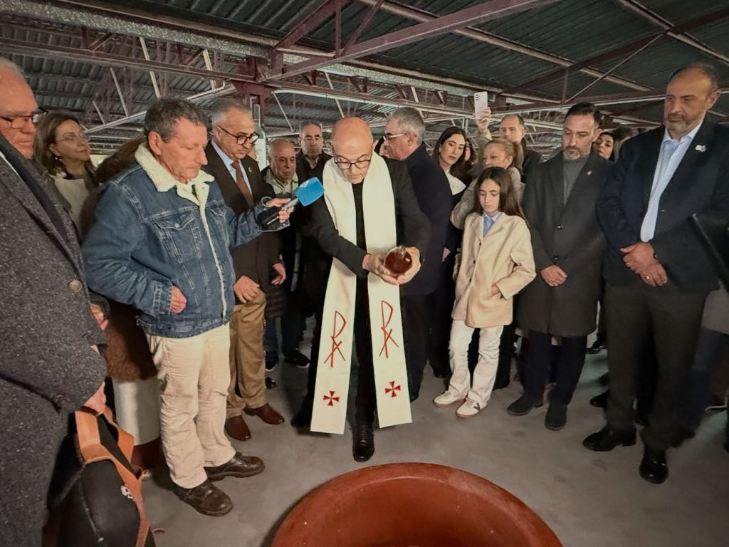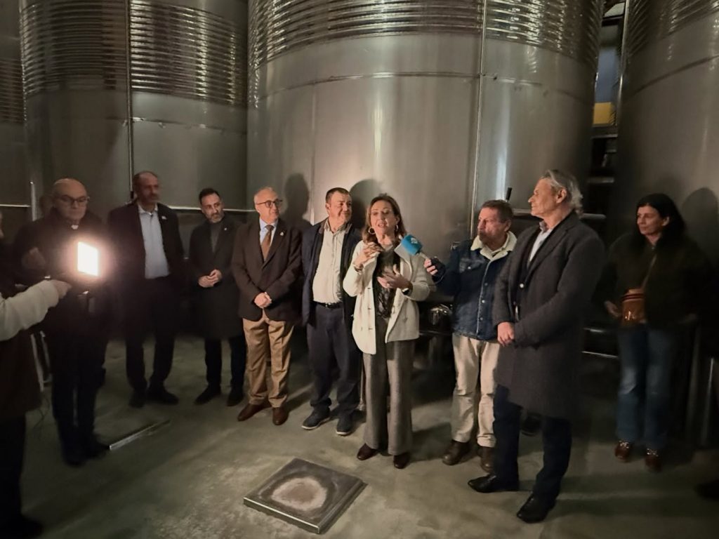 Una delegación de cofrades y festeros caravaqueños se desplazó en la tarde de ayer a Jumilla para preparar de nuevo el Vino de la Cruz para las próximas fiestas patronales de Caravaca. Las instalaciones de Bodegas San Isidro albergaron este miércoles el acto de acción de gracias por la nueva cosecha, en el que se vierte el vino bendecido por la Vera Cruz durante las fiestas patronales del año pasado en la mañana del Dos de Mayo en el depósito que ya tiene en su interior el vino producido este año, que será embotellado durante las próximas semanas para su distribución durante los festejos de 2026. El hermano mayor de la Cofradía de la Vera Cruz, Jesús López Baquero, fue el encargado de verter el vino en la boca del depósito tras la oración de acción de gracias pronunciada por el rector de la basilica Tomás Alvarez. López Baquero compartió este acto con los representantes de la Corporación Municipal, el secretario de la Comisión de Festejos y el resto de autoridades festeras. Hace unas tres décadas que se lleva realizando la acción de gracias por la nueva cosecha antes del embotellado y etiquetado de unas 6.000 botellas del conocido como Vino de la Cruz. Se trata de un vino duice que se elabora de manera tradicional y exclusiva. Representantes del Bando de los Caballos del Vino también se hicieron presentes en el acto y trasladaron hasta la bodega el pellejo que porta cada año el Caballo Histórico (el primero que corre la Cuesta del Castillo en la mañana del Dos de Mayo, ataviado a la antigua usanza) con el vino para su bendición por la Sagrada Reliquia junto con las flores, en uno de los rituales que han surgido a lo largo de los ocho siglos de presencia de la Vera Cruz en Caravaca.