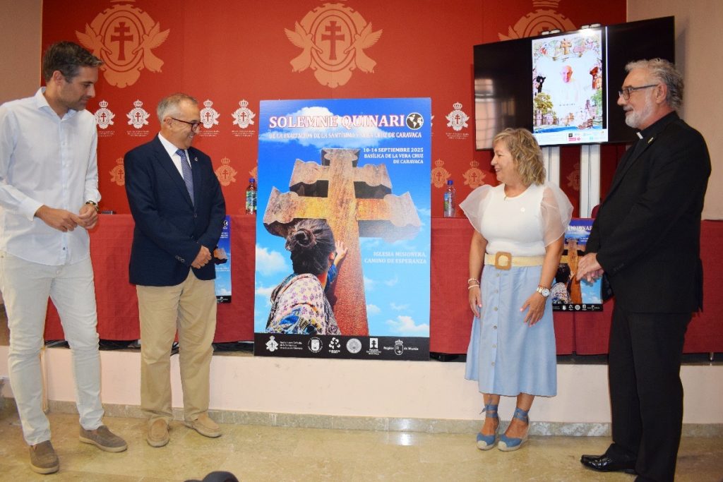 El lema elegido para las celebraciones del Solemne Quinario de la Exaltación de la Vera Cruz de Caravaca que se celebrará en la basílica entre el primer y segundo domingo del próximo mes de septiembre es “Iglesia misionera, camino de esperanza”. La presentación del programa de actos tuvo lugar en la mañana de este jueves en la Casa de la Cruz y contó con la participación del hermano mayor de la Cofradía, Jesús López Baquero, que ha estado acompañado por el rector de la basílica, Emilio Sánchez; la vocal de Liturgia, Conchi López; y el teniente de alcalde del Ayuntamiento de Caravaca de la Cruz, José Santiago Villa.